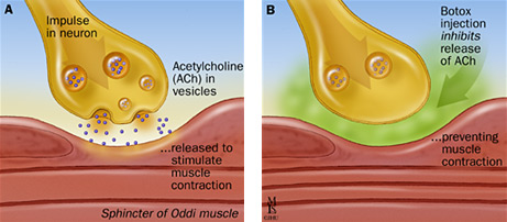 In short, botulinum toxin inhibits neurotransmitter release from the axon terminal of a neuron, blocking communication. In muscles, release of the neurotransmitter acetylcholine allows muscle contraction and movement (left). When this effect is blocked, paralysis occurs—the hallmark of botulism poisoning (right).