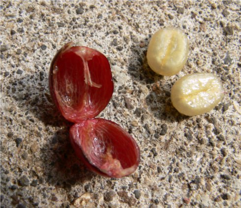 Each berry contains two seeds. It may be surprising to you that these seeds are white. Only when roasted do we see—and smell—the recognizable coffee bean (what I thought were little balls of wood when I was younger). Roasting occurs when the internal temperature of the bean reaches 200º C (392º F), causing caramelization, or starch breakdown, which browns the simple sugars. Acids and oils within the bean weaken, creating its characteristic bitter flavor. Caffeol, one such oil, is generated at 200º C and is largely responsible for coffee's flavor.