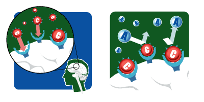 Caffeine is unique because it is both water- and lipid-soluble, allowing it to pass the blood-brain barrier and enter the nervous system. In the brain, caffeine works to counteract, or antagonize, the effect of adenosine. Because caffeine and adenosine have similar chemical structures, caffeine (below, red) can bind to adenosine receptors without activating them. In other words, caffeine is a competitive antagonist of adenosine. In this way, the sleep-inducing effect of adenosine (below, white) is blocked, promoting our lovely "coffee buzz."