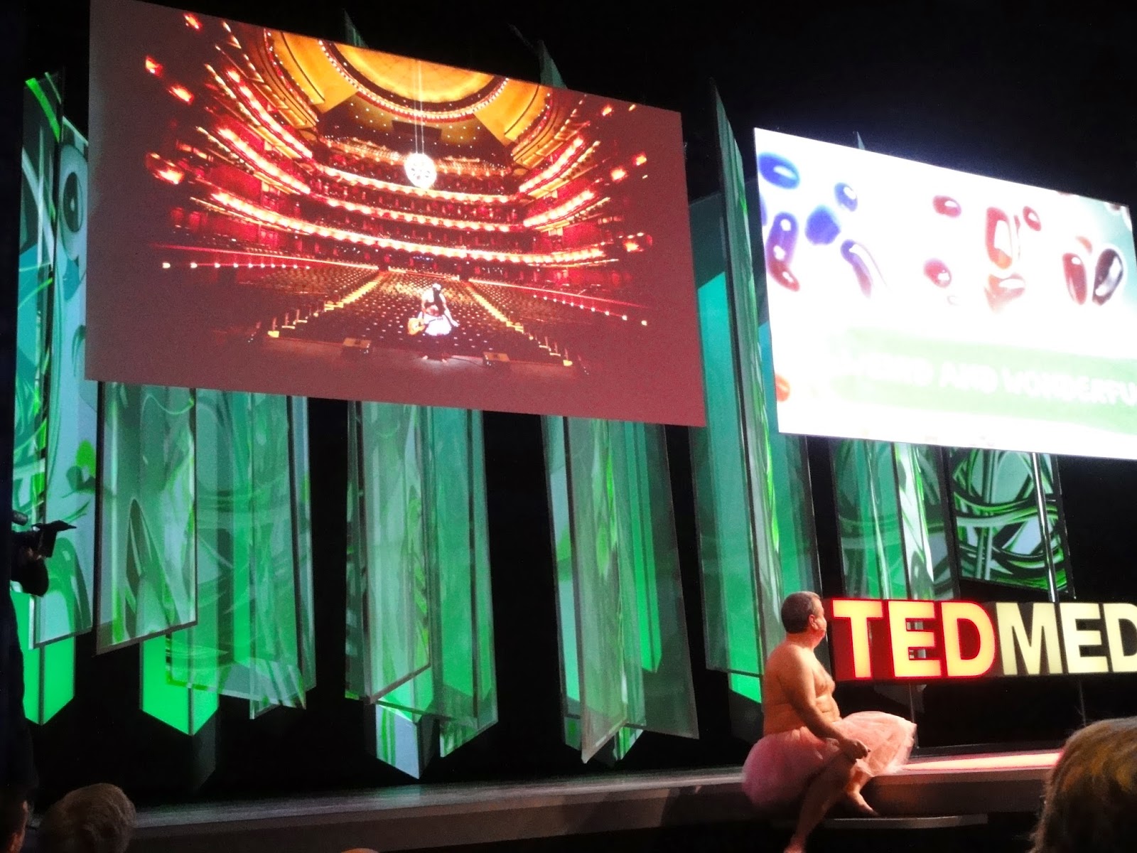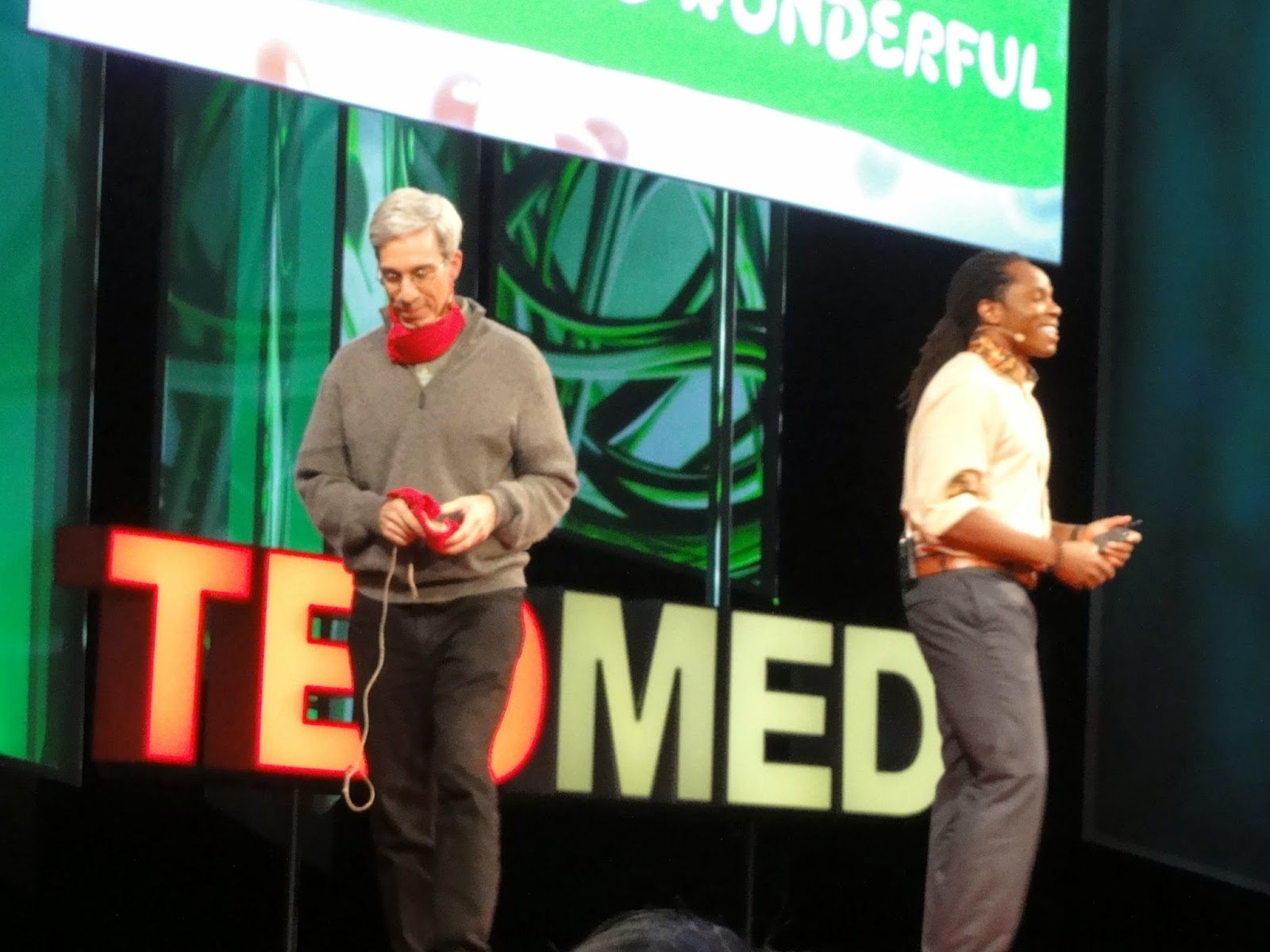 The session opened with Julian Treasure, chairman of The Sound Agency, which advises businesses on how to design their buildings with sound in mind. Treasure gave some upsetting statistics: hospital noise has doubled in magnitude in the past 40 years; it's 12X louder during the day and 8X louder at night than recommended by the World Health Organization; and loudness is the #1 complaint of hospital patients in 2013. Treasure suggests hiring acoustic engineers, employing vibrating pagers and silent trolleys and footwear, and masking sound with white noise or music. Next, architect and scientist Mariana Figueiro spoke of the range of afflictions to which we're vulnerable when we don't get appropriate amounts of (blue!) light during the right time of day. Jeff Karp then spoke about his brilliant "bioinspired" technology, including how imitating spider webs improved adhesive tape for premature babies and how barbs, like on porcupine quills, are much better for the skin than tradition staples. Next, anesthesiologist Emery Brown gave us a primer on general anesthesia (which is not sleep!). It's actually, he says, a "drug-induced reversible coma," and different anesthetics have different signature EEG patterns. Neurosurgeon and researcher Uzma Samadani then spoke about her company Oculogica, which creates eye-tracking diagnostic technology to detect concussions and other brain injuries that do not show up on imaging. Finally, Debra Jarvis, the "irreverent reverend," spoke on the importance of finding meaning from crappy situations. She told us about a man with cancer who would go for his chemotherapy treatments alone. When Jarvis asked why he didn't bring anyone, he said he didn't have any friends. Once cancer-free, he vowed to find the meaning of friendship; when Jarvis attended his Christmas Eve party later that year, his house was packed to the brim.